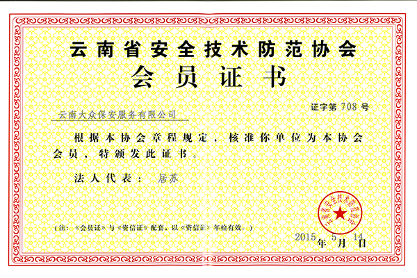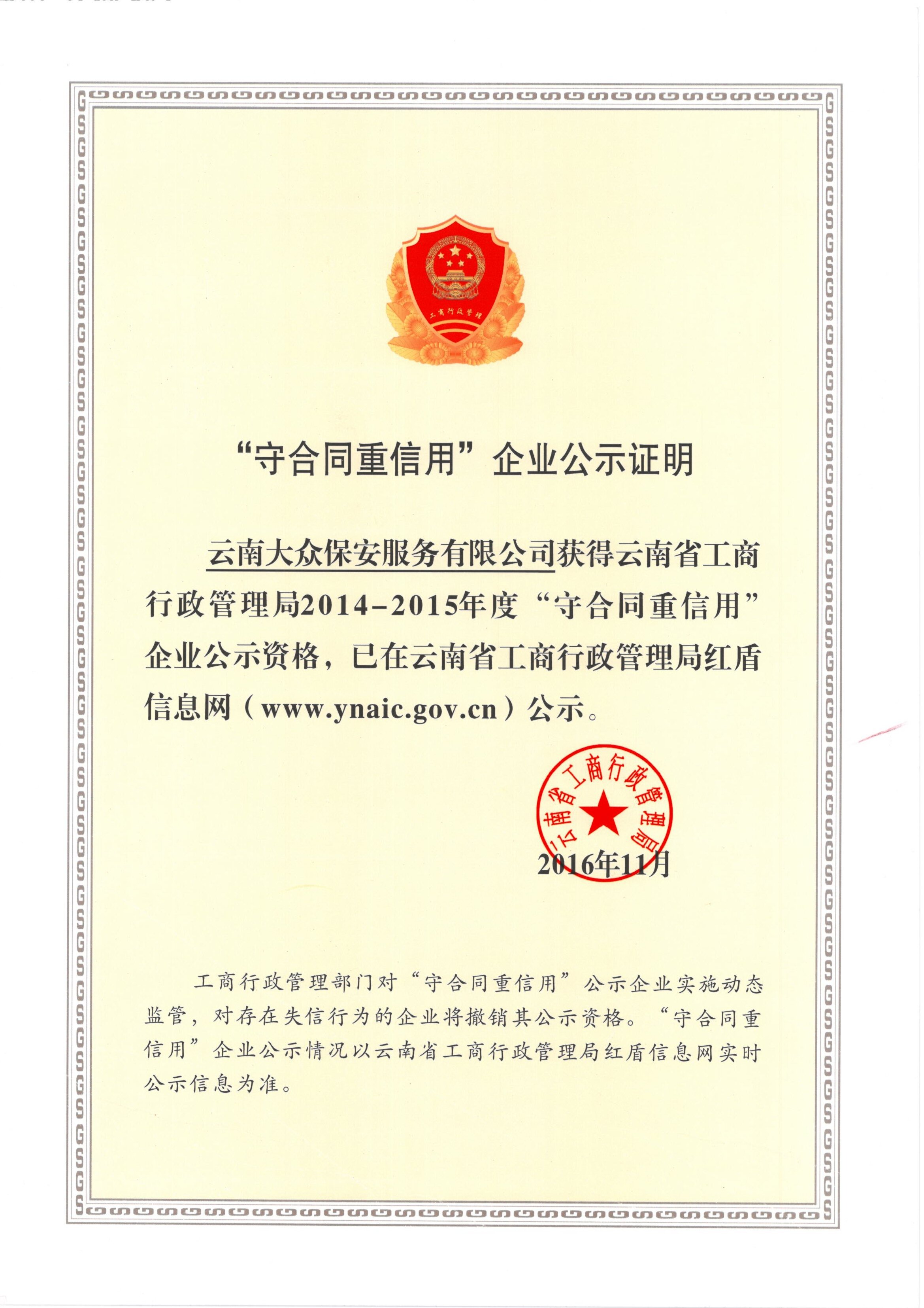 大眾安保公司榮獲2014-2015年度云南省“守合...