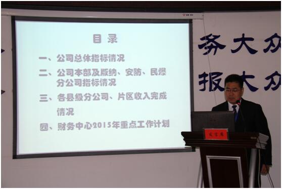會(huì)議首先由公司副總經(jīng)理段元鑫帶領(lǐng)參會(huì)人員進(jìn)行企業(yè)三大作風(fēng)口號和手勢訓(xùn)練;隨后財(cái)務(wù)總監(jiān)對2014年度經(jīng)營計(jì)劃執(zhí)行情況及各業(yè)務(wù)模塊計(jì)劃目標(biāo)完成情況進(jìn)行了披露;緊接著各中心、分公司負(fù)責(zé)人對2014年度工作完成情況及2015年度工作計(jì)劃進(jìn)行了報(bào)告;會(huì)議第四項(xiàng)議程,由公司副總經(jīng)理對各業(yè)務(wù)模塊工作報(bào)告進(jìn)行了點(diǎn)評及工作安排;最后,公司總經(jīng)理進(jìn)行了總結(jié)性發(fā)言,要求各中心、分公司緊緊圍繞集團(tuán)戰(zhàn)略發(fā)展目標(biāo)和公司五年規(guī)劃,做實(shí)保安傳統(tǒng)業(yè)務(wù),把握技防、物防新興業(yè)務(wù),團(tuán)結(jié)一致,銳意進(jìn)取,為全面完成2015年總體工作部署和目標(biāo)任務(wù),譜寫大眾保安輝煌業(yè)績新篇章而努力奮斗!
