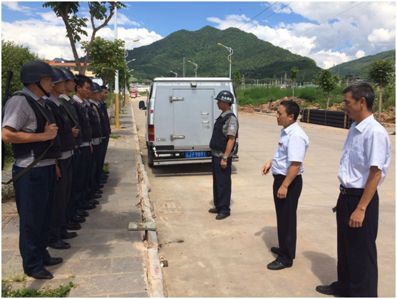 為進(jìn)一步落實(shí)武裝押運(yùn)安全管理制度,增強(qiáng)守押?jiǎn)T安全責(zé)任意識(shí),提高押運(yùn)員押運(yùn)途中突發(fā)事件處置的能力。2016年7月25日15:00時(shí),大眾保安公司景谷分公司組織信用社全體押運(yùn)員開(kāi)展武裝押運(yùn)途中遇突發(fā)事件(搶劫、闖警戒區(qū)、途中檢查、攔截等)預(yù)案演練,此次演練邀請(qǐng)到景谷傣族彝族自治縣農(nóng)村信用合作聯(lián)社安全保衛(wèi)科經(jīng)理邱繼平、副經(jīng)理周興參加。