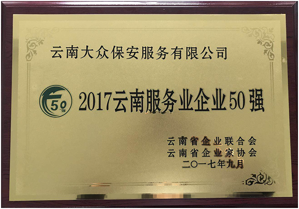 2017年9月29日,2017云南企業(yè)100強(qiáng)發(fā)布會(huì)暨大企業(yè)高峰論壇在昆明云安會(huì)都國(guó)際會(huì)議中心舉行。云南大眾保安服務(wù)有限公司再次被授予“云南服務(wù)業(yè)企業(yè)50強(qiáng)”榮譽(yù)稱號(hào),這是大眾保安公司自2016年以來連續(xù)兩次獲此殊榮。